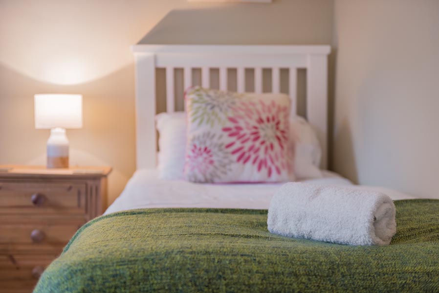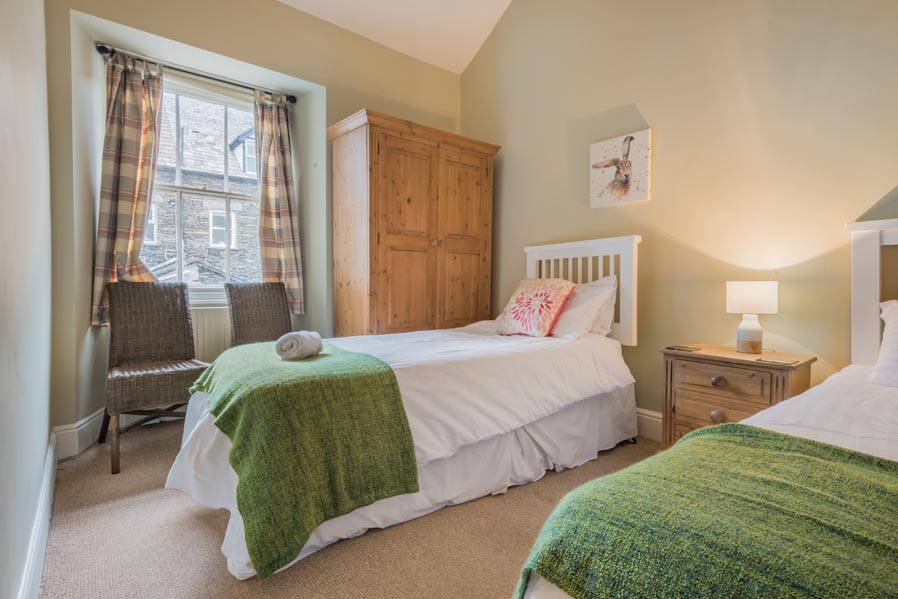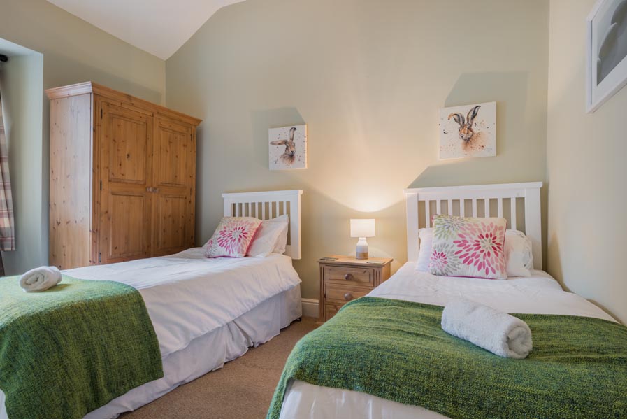 Twin bedroom: The twin bedroom has two single beds, bedside table and wardrobe.