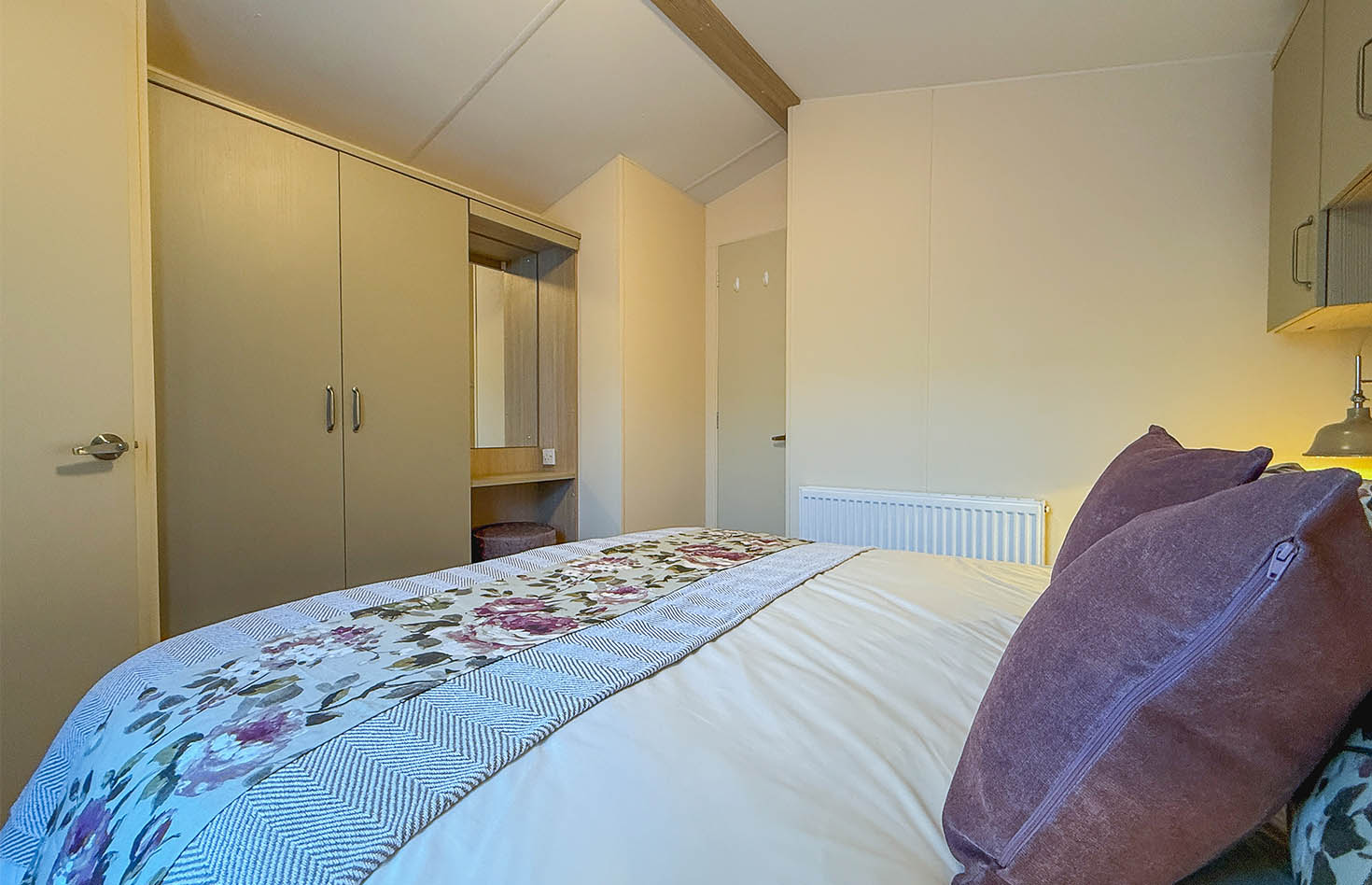 The bedrooms feature plush headboards and coordinating curtains to provide a relaxing and comfortable environment. The double bedroom also features an en-suite toilet, bedside wall lamps and mirrored dressing area, giving the space a real feeling of luxury.