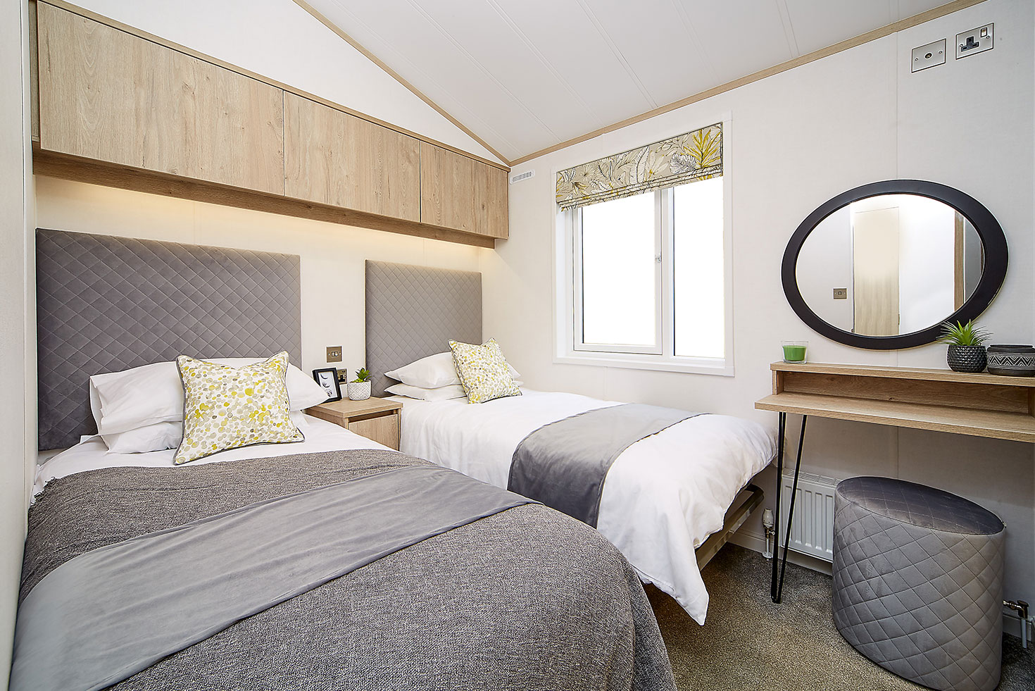 The Atlas Jasmine Lodge master bedroom suite has king-sized lift-up storage bed, light wood fitted furniture, dressing table and chair, large walk-in wardrobe and en-suite shower room complete with fitted wash basin, WC and shower cubicle. The second bedroom – the twin bedroom features two 3ft single beds, sliding mirrored wardrobe doors to the en-suite shower room.